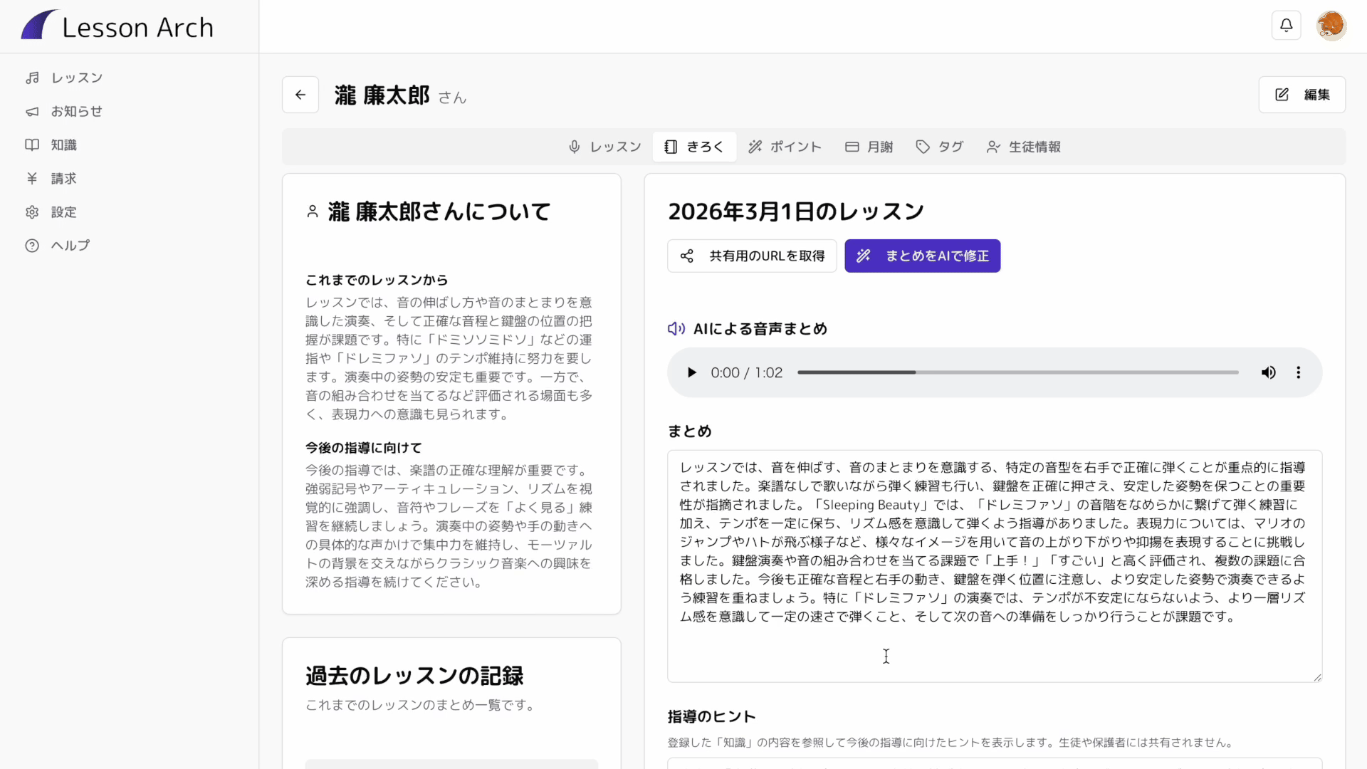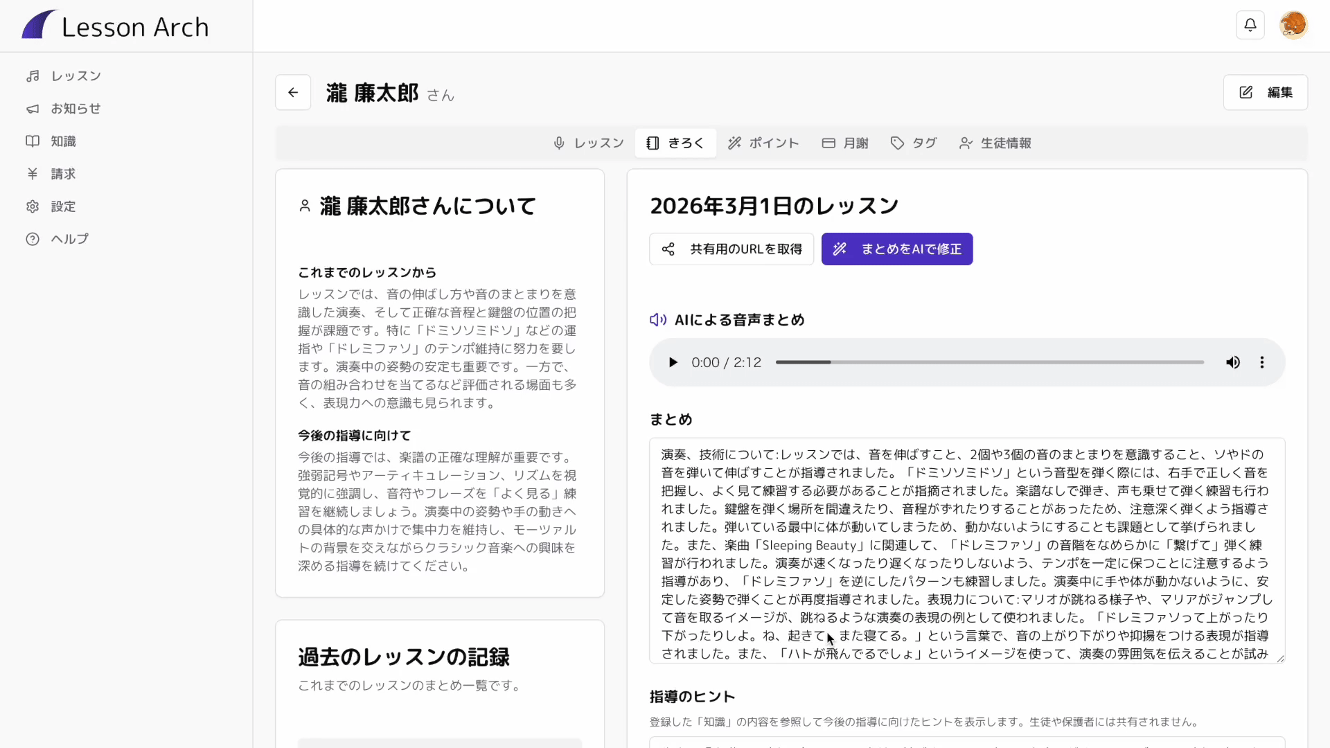 Lesson Arch は音楽教室のレッスンを支援する AI 機能を備えたサービスです。このページではおすすめの順番に沿って使い方をご案内します。